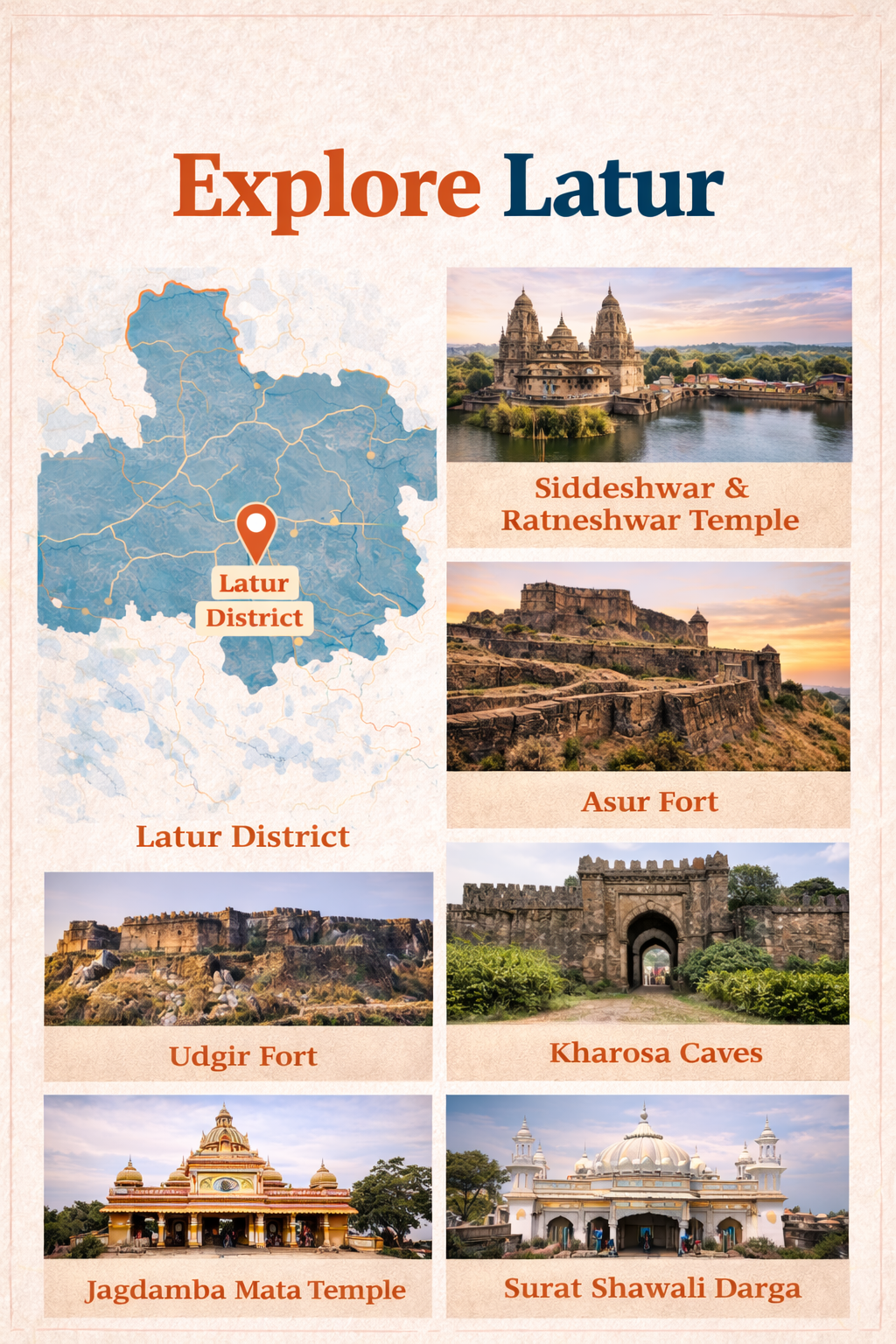 Historically, Latur has strong roots dating back to ancient and medieval periods, with influences from various dynasties. Landmarks such as Siddheshwar and Rameshwar temples reflect its deep spiritual and architectural legacy. Forts, caves, and heritage sites around the city tell stories of valor and tradition. This historical character gives Latur a unique cultural charm.
